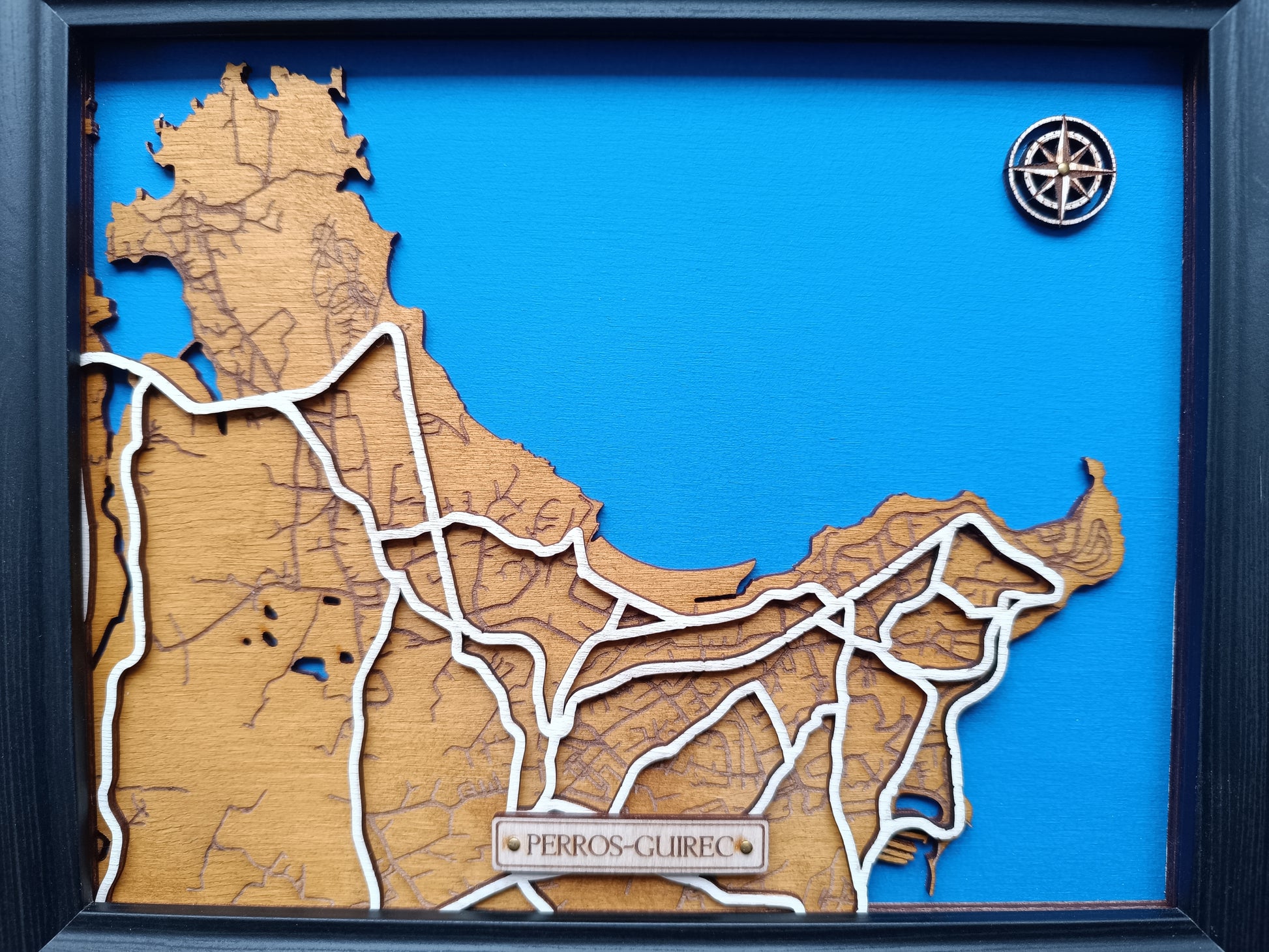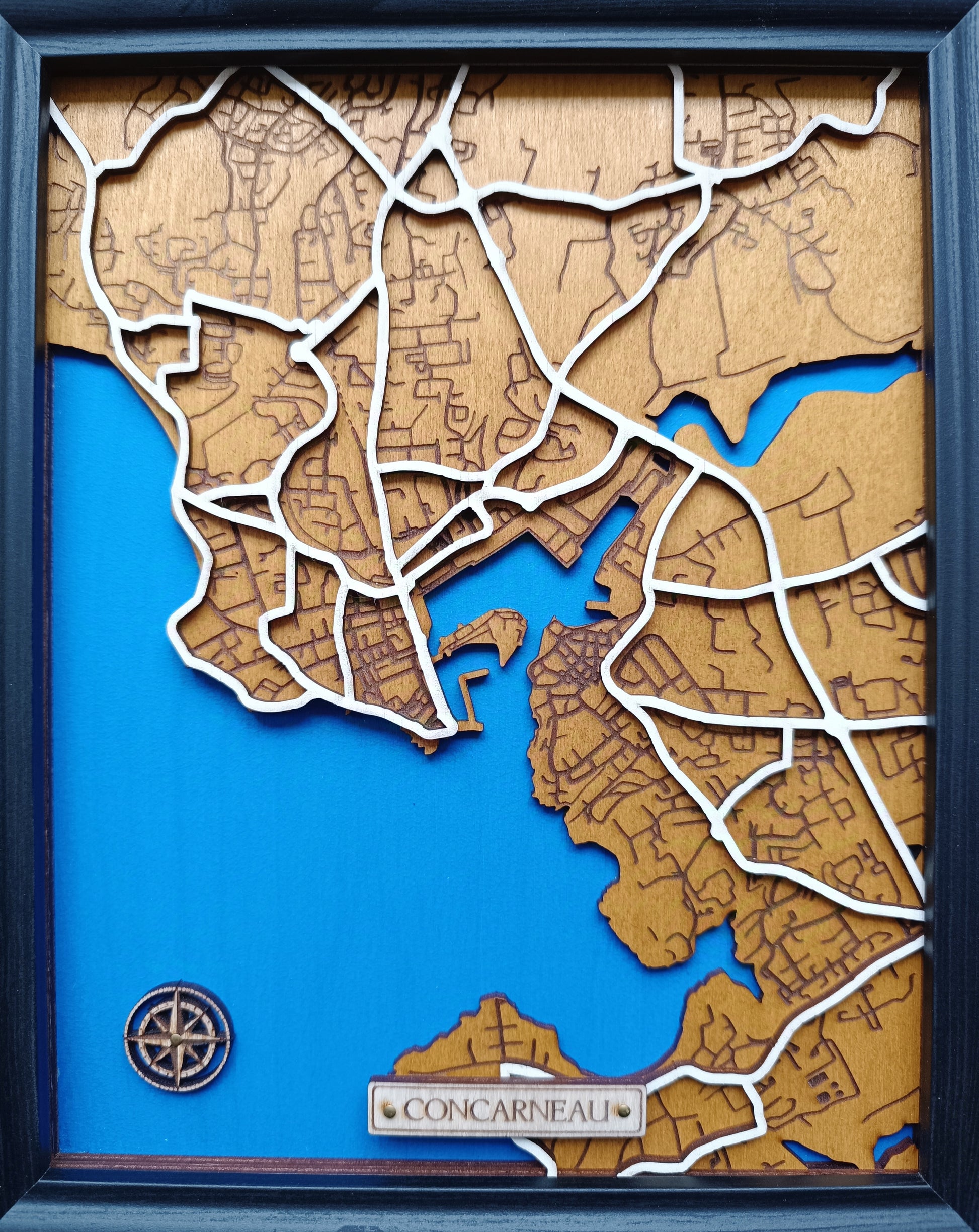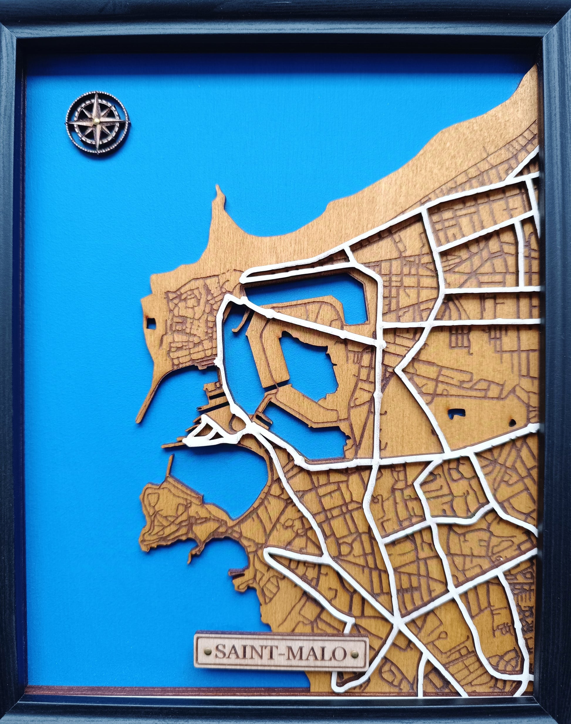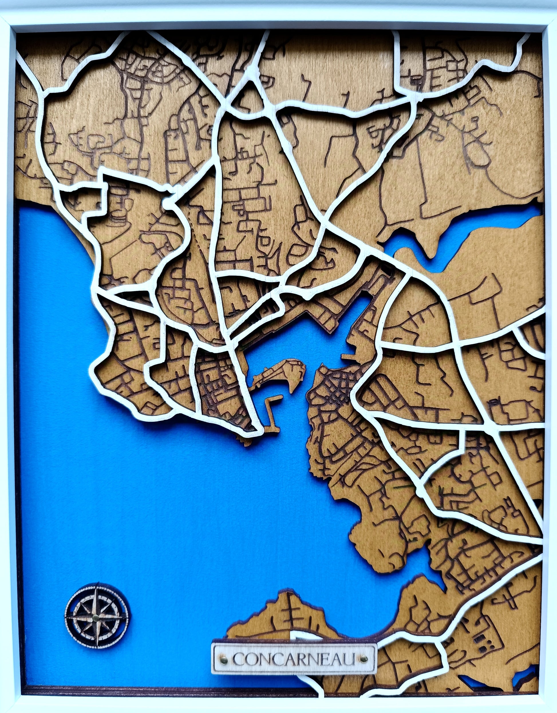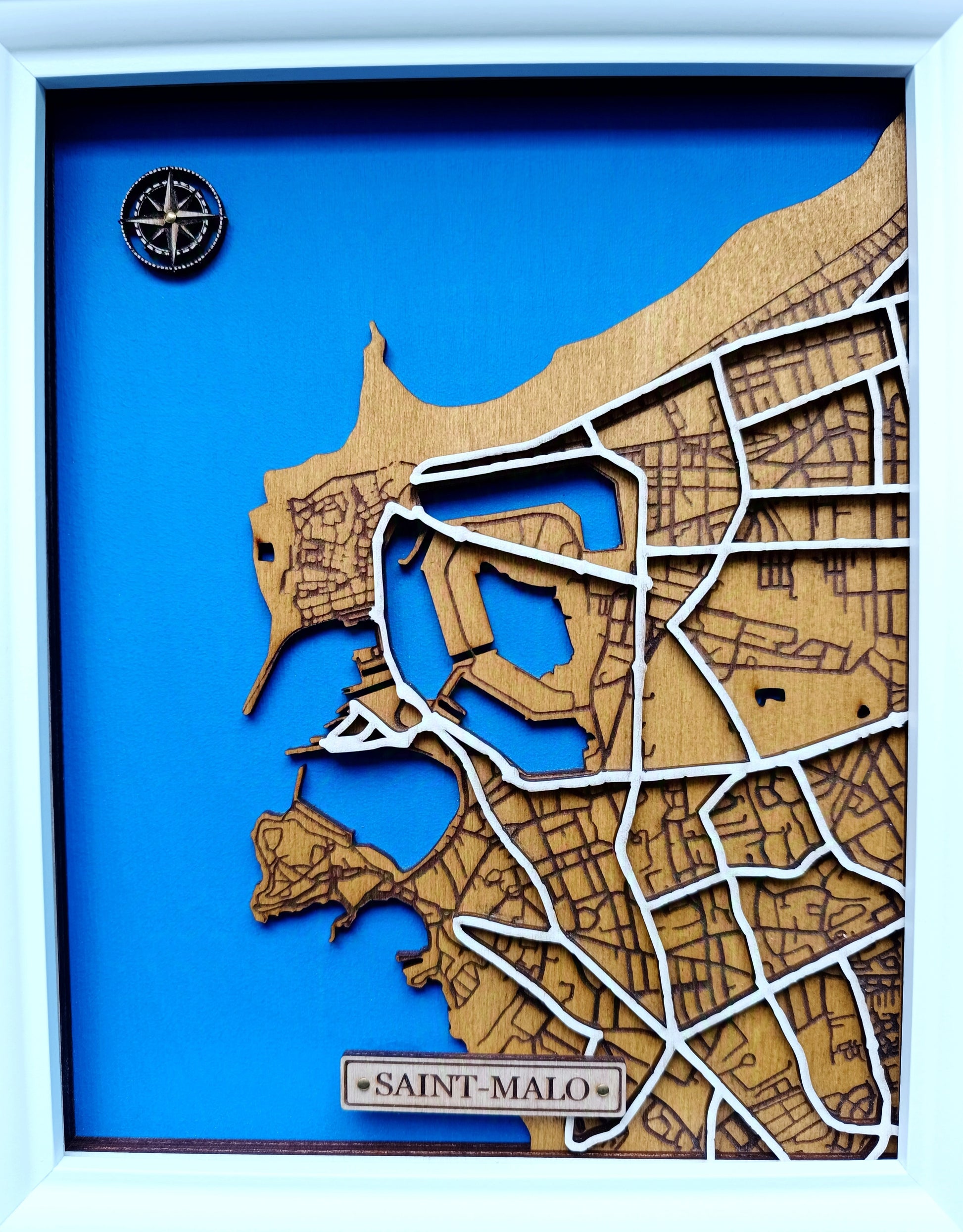 Découvrez ces représentations uniques, gravées dans le bois avec finesse et passion. À travers un jeu de couches superposées, ces cartes transforment chaque ville en une œuvre d’art en relief, où les rues prennent vie et les contours côtiers plongent dans un bleu profond.